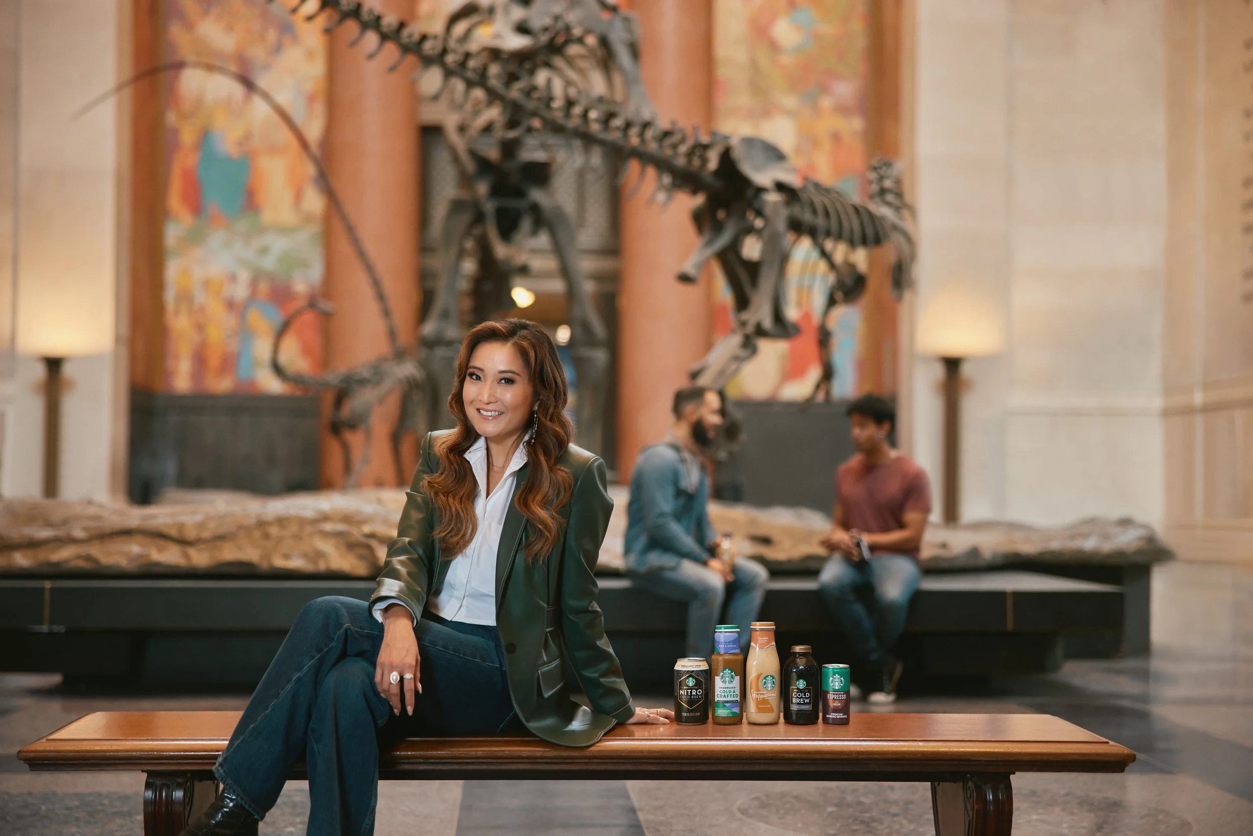 Ashley Park sits next to Starbucks Ready-to-Drink Beverages at the American Museum of National History